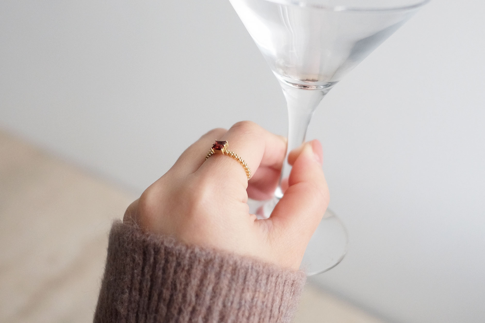 誕生石リングやネックレスは、シンプルで上品なデザインが多く、毎日の装いにも自然になじみます。深紅の輝きは肌なじみがよく、華やかさと落ち着きを兼ね備えた印象に。ジュエリーを主役にしたいときは、装いを落ち着いた色やニュートラルカラーでまとめるのがおすすめです。冬にはブラウンやベージュ、カーキと合わせることで、より深みのある上品な雰囲気を楽しめます。