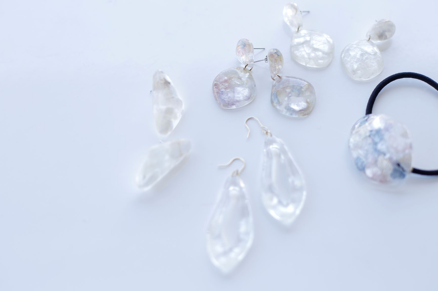 今回のシリーズは、カピス貝のフレークを樹脂に閉じ込めた「封入」という手法で作られています。クリアな樹脂で閉じ込めることにより、カピス貝の特徴でもある透け感を損なうことなく、デザインとして取り入れた加工方法です。それと同時に、薄く割れやすいカピス貝にアクセサリーとしての強度も持たせてくれています。これにより、シェルの表面にニスを施すラミネート加工などとは違った魅力をもつことが出来ました。