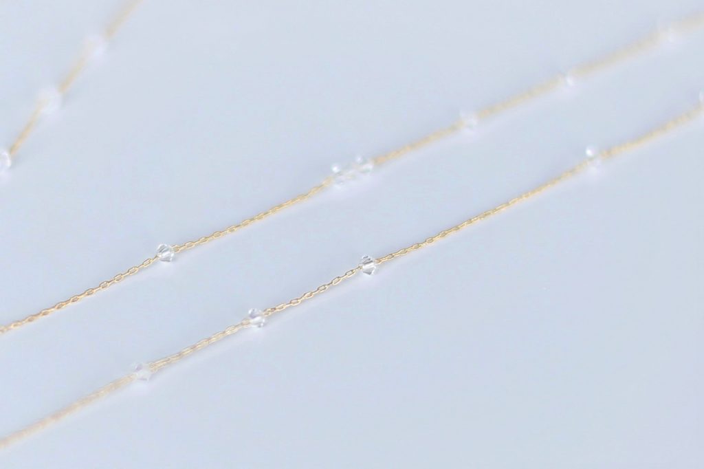 チェーンにスワロフスキーの石を通し、前後のチェーンを拡げて石を止めています。一つ一つ手作業で作られているため、見た目が重くなるカンやパーツがなくなり、チェーンとスワロフスキーが馴染むことで、今回のシンプルな美しいデザインをさらに惹きたててくれています。