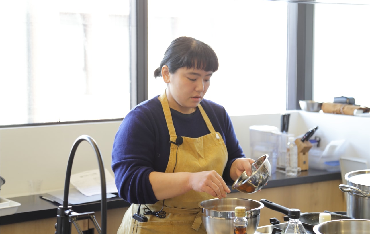 ナムルはお口直しの料理でもあるので、味付けは控えめで。最初の塩もみでちょうどいい塩梅を決めるのがポイント。それぞれのナムルの味を変えて、お互いが引き立てあうように。そんな料理の構成を考える視点も勉強になります。ゴマは指でランダムにつぶしながら入れることで、口に入れたときに香りの強弱のリズムが生まれるように。何気ない工程のひとつひとつの積み重ねがおいしさを導く。プロセスの細部にまで、あゆみ食堂ならではの感性が息づきます。